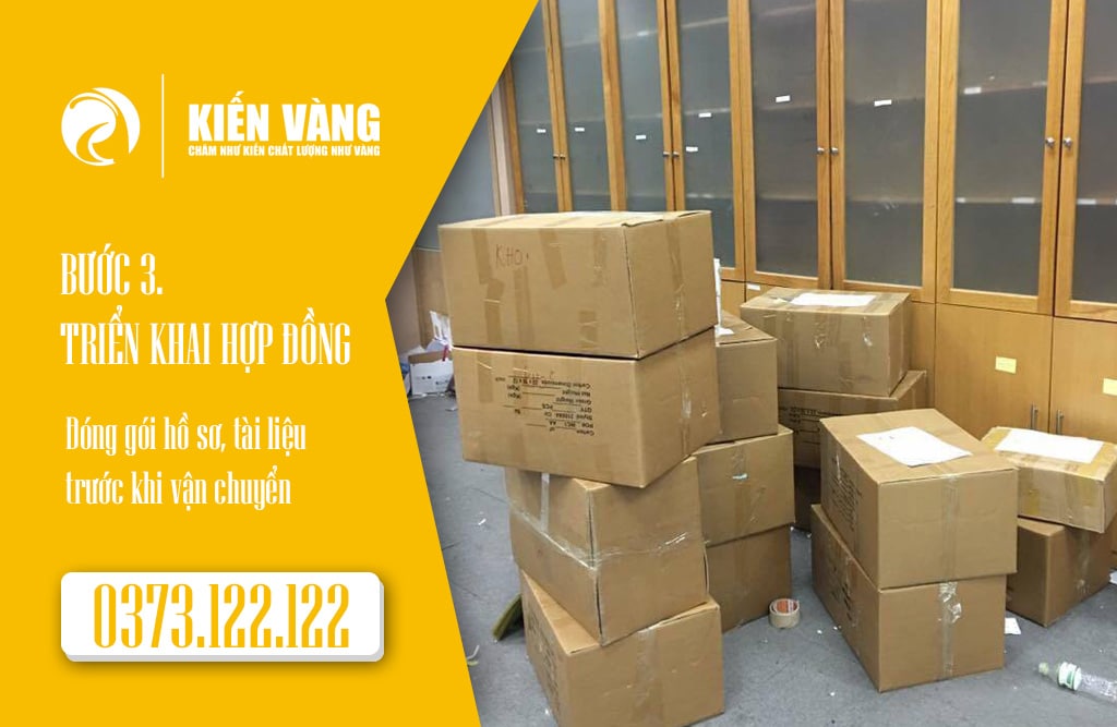 Hồ sơ, tài liệu sẽ được đóng gói theo phòng ban vào từng thùng carton ghi chú rõ ràng từng phòng để dễ dàng tìm kiếm và sắp xếp tại văn phòng mới.